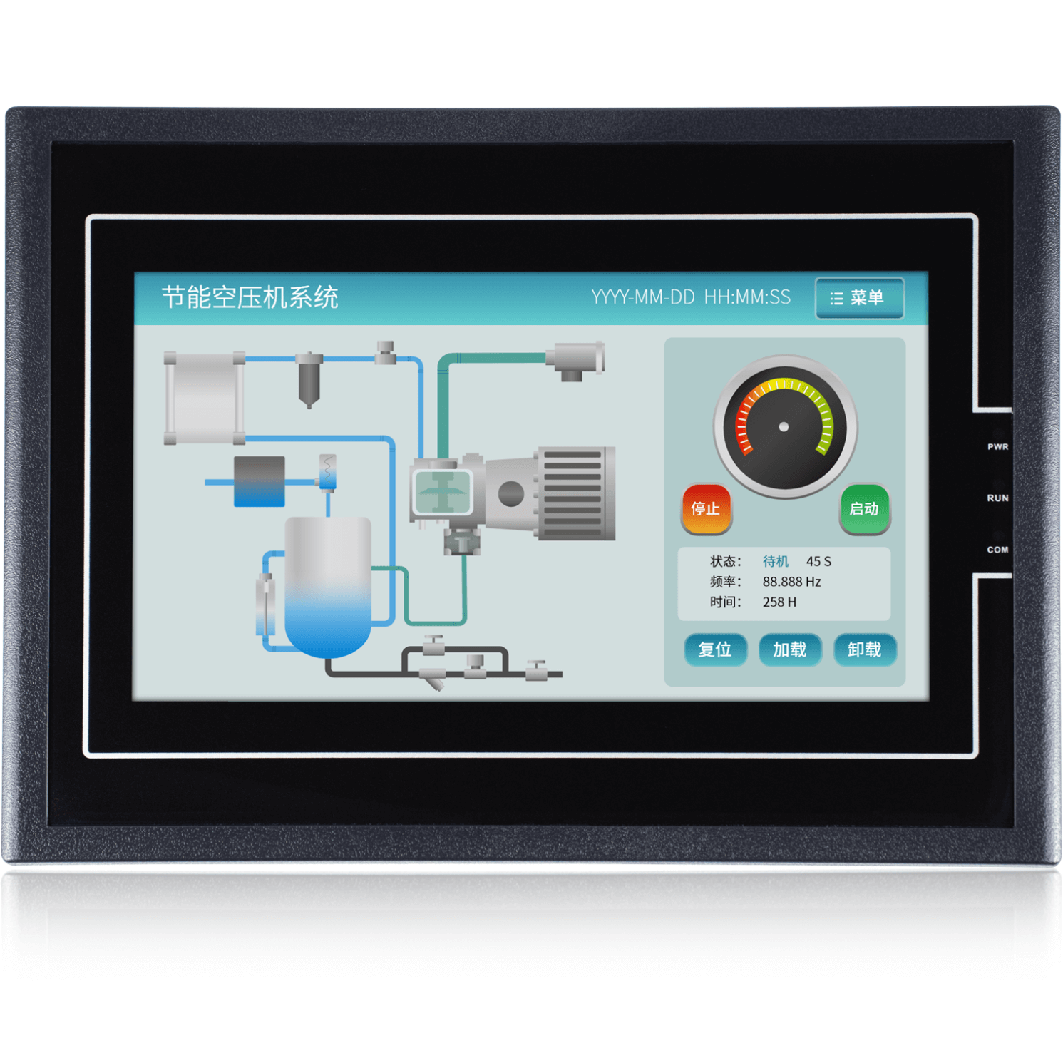 金璽HMI在變頻器的應用,采用MODBUS協(xié)議與變頻器通訊,對變頻器進行啟停控制,對變頻器的電流,頻率,功率等進行監(jiān)控。